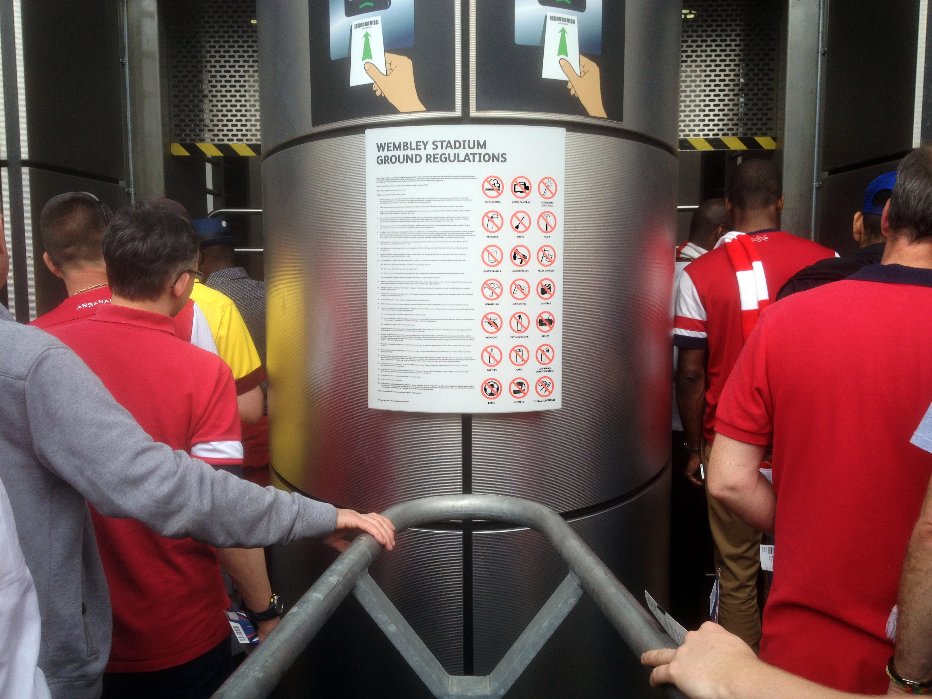 Fans entering Wembley Stadium – note that the bottom left logo on the sign indicates that footballs are not allowed at Wembley …