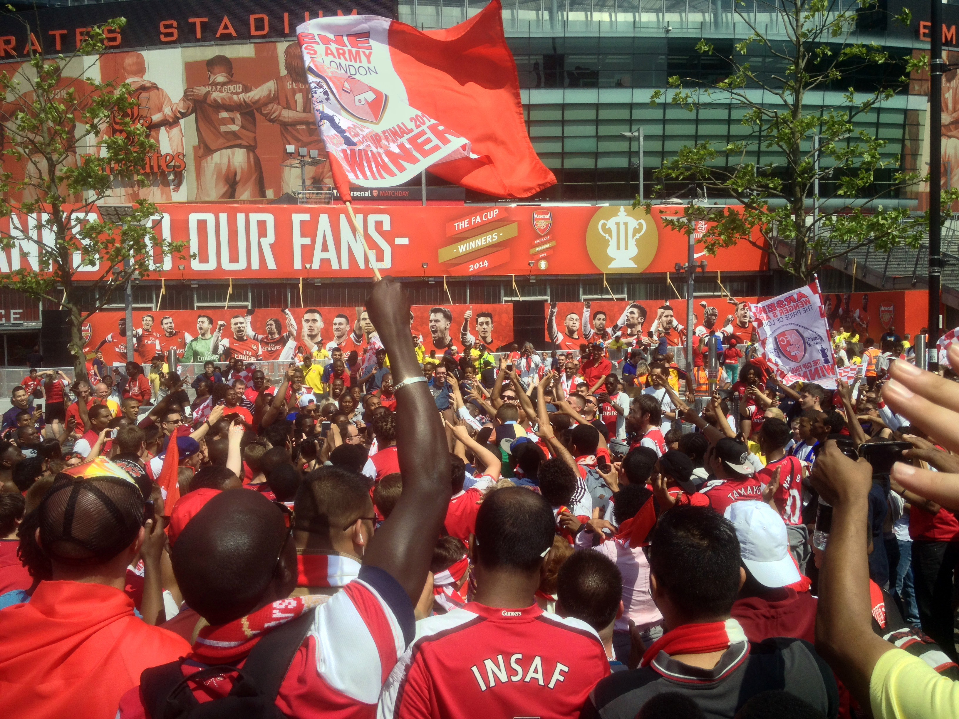 Arsenal fans would have gathered by the Highbury clock tower to watch local lad Pat Rice and his troops celebrate the double in 1971. The fans were there again on Sunday, all day long.