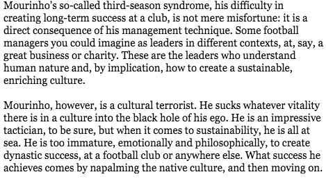 It’s just as well we know the great football men are not motivated by money. Otherwise people might be looking at the curious incentive structure of football management, where the fastest way to make a gigantic fortune is often to lose your job, and draw all the wrong conclusions.”
