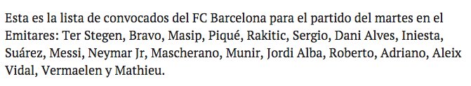 Barcelona squad for Tuesday (Marca). Turan suspended, Douglas, Sandro and Bartra left out. Vermaelen included.