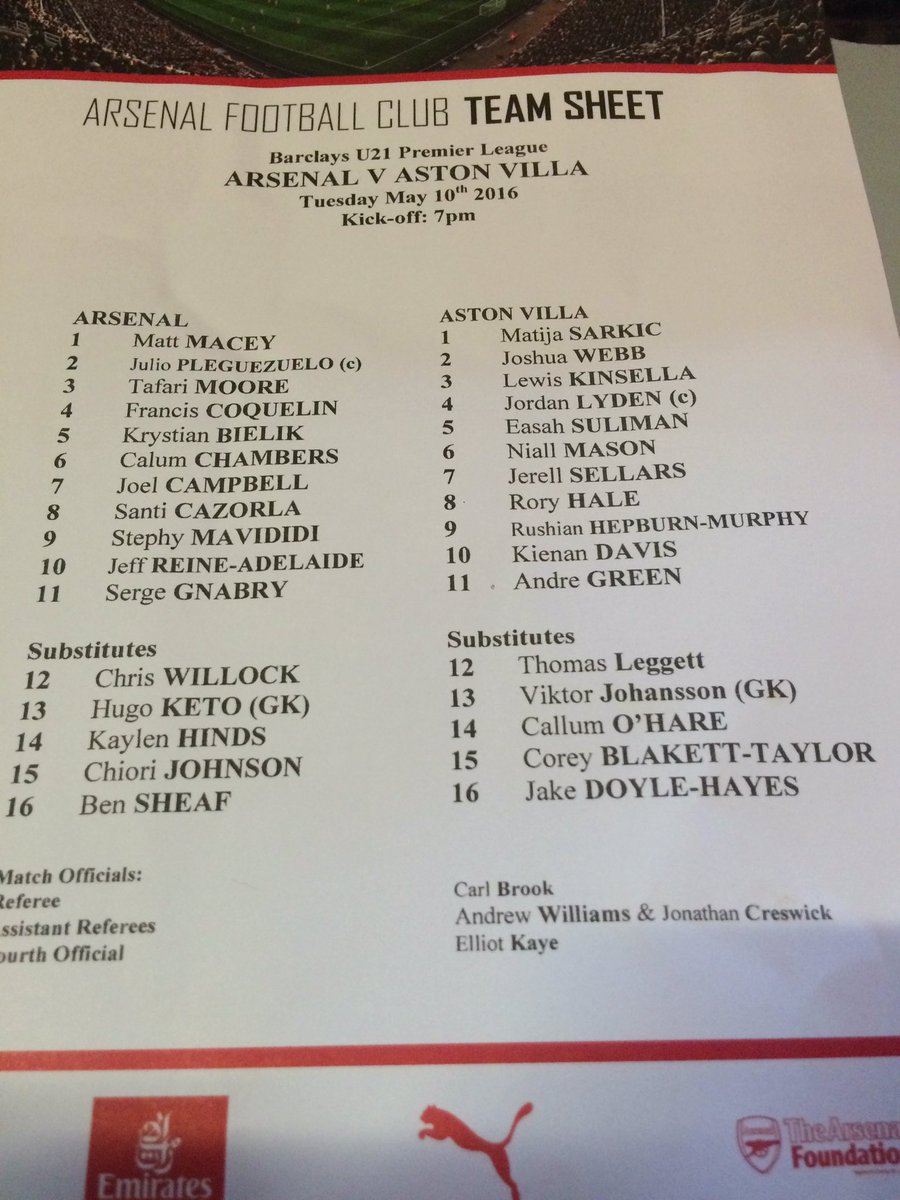 Arsenal going all out for promotion in the U21’s, Coquelin, Cazorla, Rosicky, Chambers and Gnabry all in the starting 11