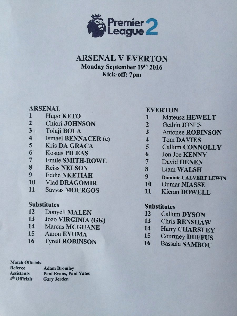 This wasn’t helped by an old fat ref who never really got to grips with the tackles just after the ball had gone or the digs in the back, he even had the cheek to book two of our lads when they fought back. Reiss Nelson who I think is still only 16 played centre midfield I think for the first time and although he was far more skillful than anyone else on the park it was the big lumbering Tom Davies of Everton who ran the midfield. Whenever Nelson did get past him Davies just clipped his heels accepting free kicks when he had to.