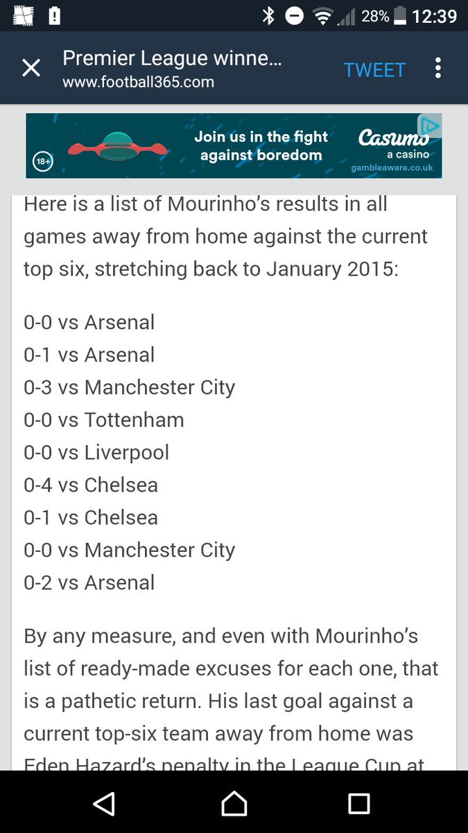 Great being back at the Emirates for only the 2nd time this season and whilst anything other than a mind-numbing draw looked unlikely at half-time, we rode our good fortune to come away deserved victors. We were the only side interested in playing actual football and there’s no doubt in my mind that the game as a sport would be dead on its feet if everyone employed Jose’s tediously tired, dried up tactics.