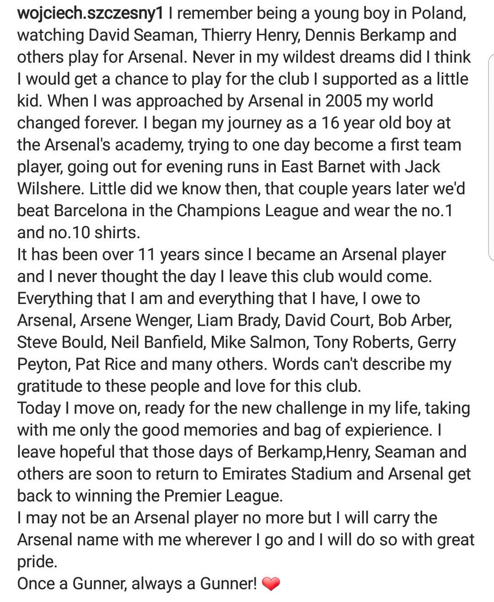 Szczesny has posted an instagram message where he is full of praise for Arsenal and how they helped him in his career.