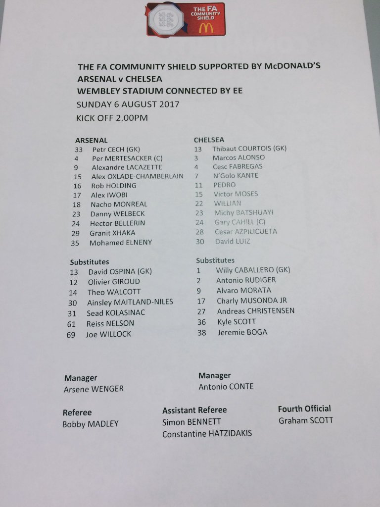 Chelsea team: Courtois; Azpilicueta, David Luiz, Cahill (c); Moses, Fabregas, Kante, Alonso; Willian, Batshuayi, Pedro.