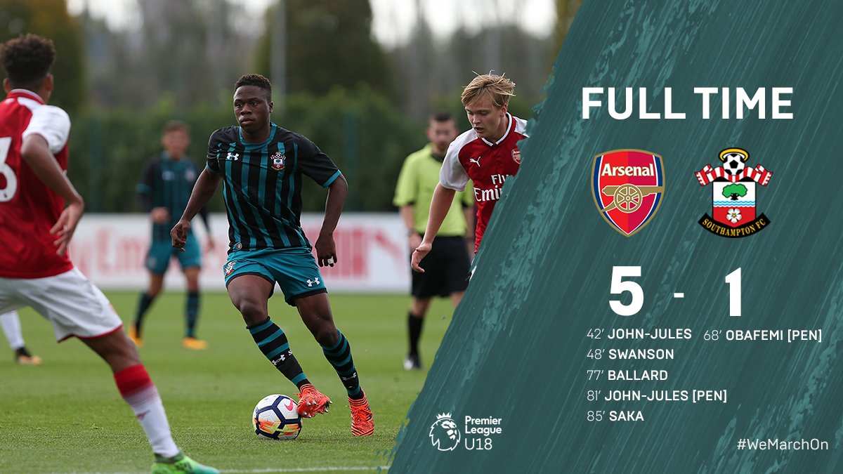 Arsenal U18s v Southampton: Virginia; Daley-Campbell, Clarke, Ballard, Thompson; Omole, M. Smith; Swanson, John-Jules, Saka; Balogun.