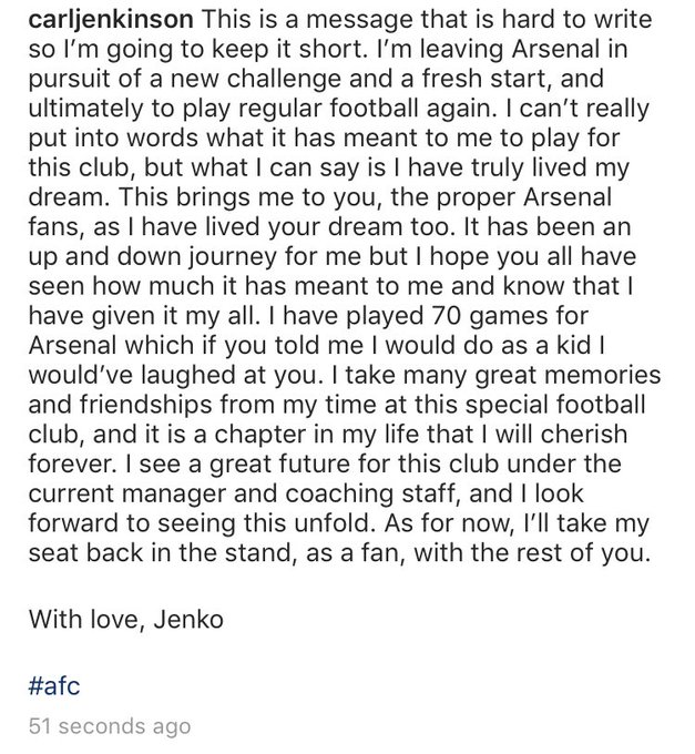This is a message that is hard to write so I’m going to keep it short. I’m leaving Arsenal in pursuit of a new challenge and a fresh start, and ultimately to play regular football again. I can’t really put into words what it has meant to me to play for this club, but what I can say is I have truly lived my dream. This brings me to you, the proper Arsenal fans, as I have lived your dream too. It has been an up and down journey for me but I hope you all have seen how much it has meant to me and know that I have given it my all. I have played 70 games for Arsenal which if you told me I would do as a kid I would’ve laughed at you. I take many great memories and friendships from my time at this special football club, and it is a chapter in my life that I will cherish forever. I see a great future for this club under the current manager and coaching staff, and I look forward to seeing this unfold. As for now, I’ll take my seat back in the stand, as a fan, with the rest of you.